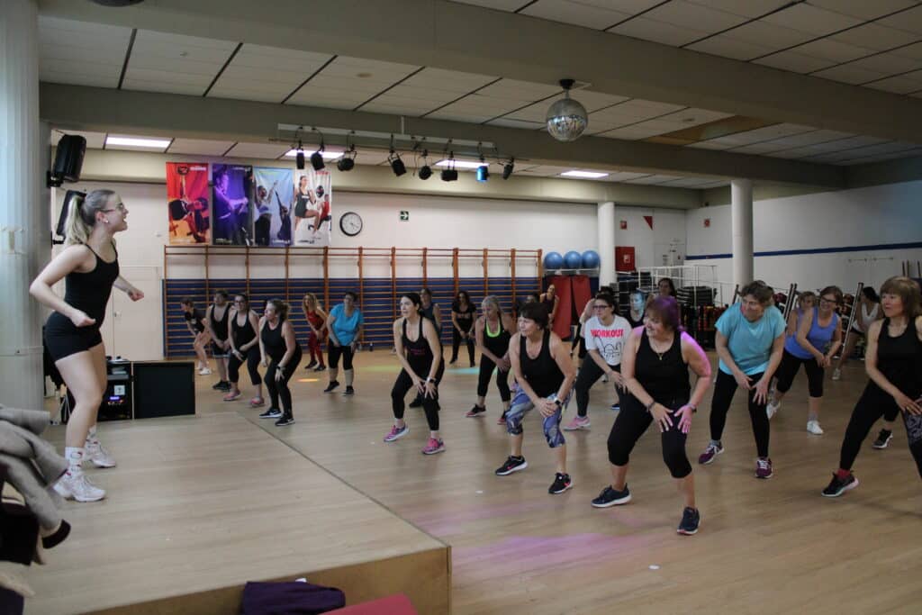 Zumba és una ACTIVITAT de fitness que es basa en coreografies aeròbiques de balls llatins amb un alt component de diversió i de ritme. Entre les seves rutines principals, utilitza ritmes llatinoamericans, com són la salsa, el merengue, la cúmbia, el reggaetón, la samba, entre d’altres. A cada sessió de Zumba, es pot arribar a cremar de 300 a 760 calories. A més a més, es realitza un treball cardiovascular i tonificació de cames, abdominals i braços, fomentant la flexibilitat per mantenir el cos saludable.